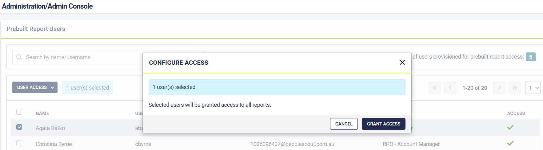 Click on User Access drop-down, select Grant User Access from the drop-down.