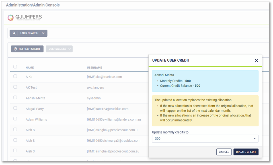When a user is granted access to QJumpers, they are allocated 300 monthly credits by default. If usage increases due to higher hiring activity or decreases during slower periods, the credit allocation can be adjusted as needed.