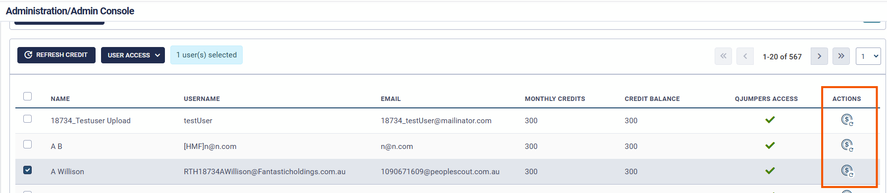 Refresh Credit: This button refreshes the credit balance column to fetch the latest credit information for each user.