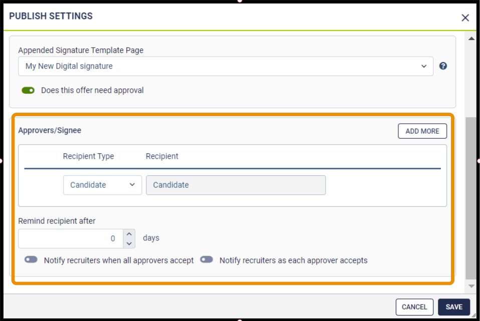 If the offer letter that is being published to the candidate for signing digitally needs to undergo approval from stakeholders, then click on the toggle switch and the approvers/ signee section appears.