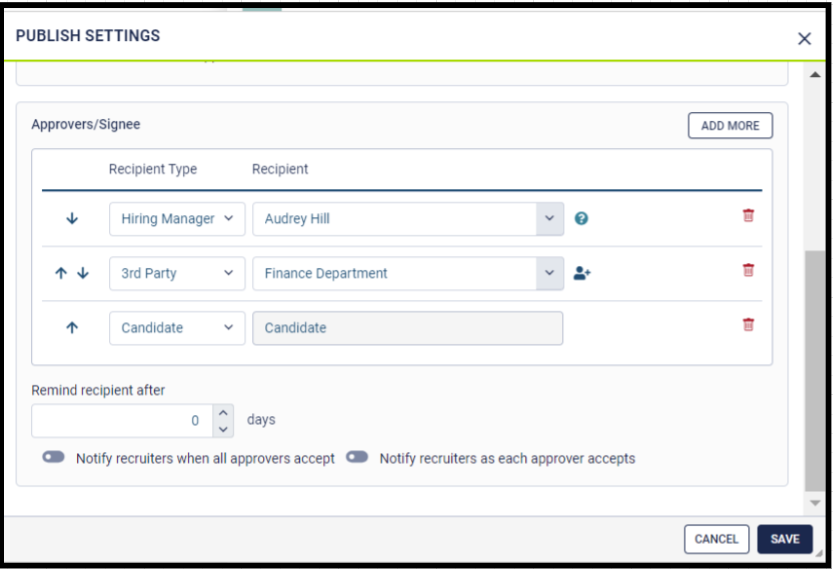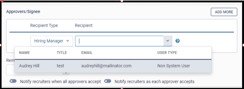 - Notify recruiters as each approver accepts: If this toggle switch is on, the recruiter would be notified when each approver/ reviewer approves or declines the offer letter.