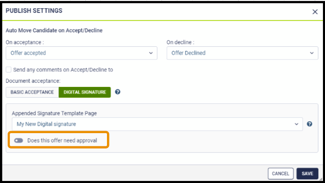 The approval workflow step would ensure that the offer letter and other documents have gone through various levels of review and each stakeholder is given a chance to approve or decline the offer letter before publishing it.