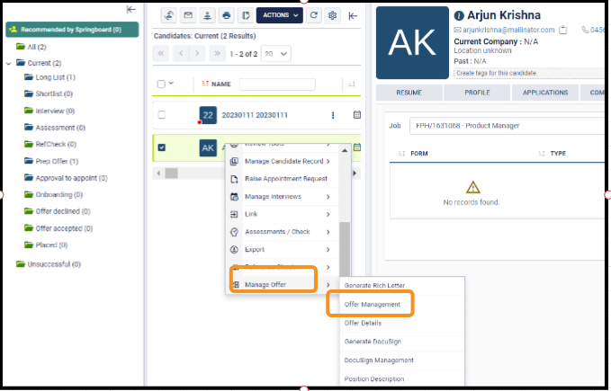 - Offer management from candidate action menu