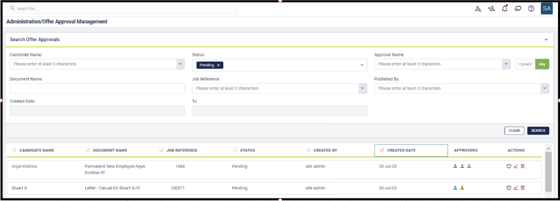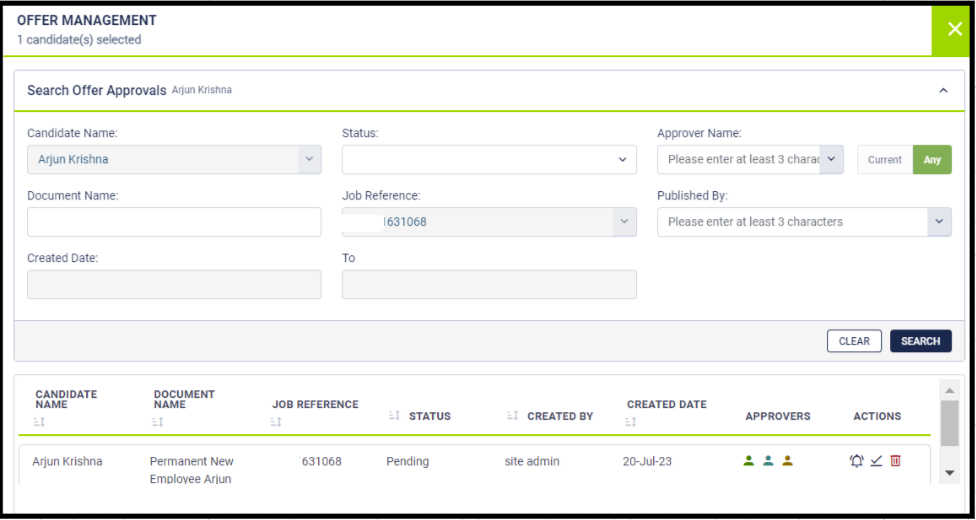 Approve the offer letter – If the logged in user is the current approver, then they can use the tick icon to approve the offer letter.
