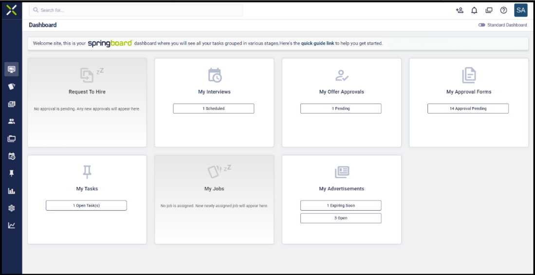 By default, all existing and new hiring managers will be presented with the Hiring manager dashboard upon login to their Springboard instance. They can however, switch to the standard dashboard anytime using the toggle-switch available at the top-right.